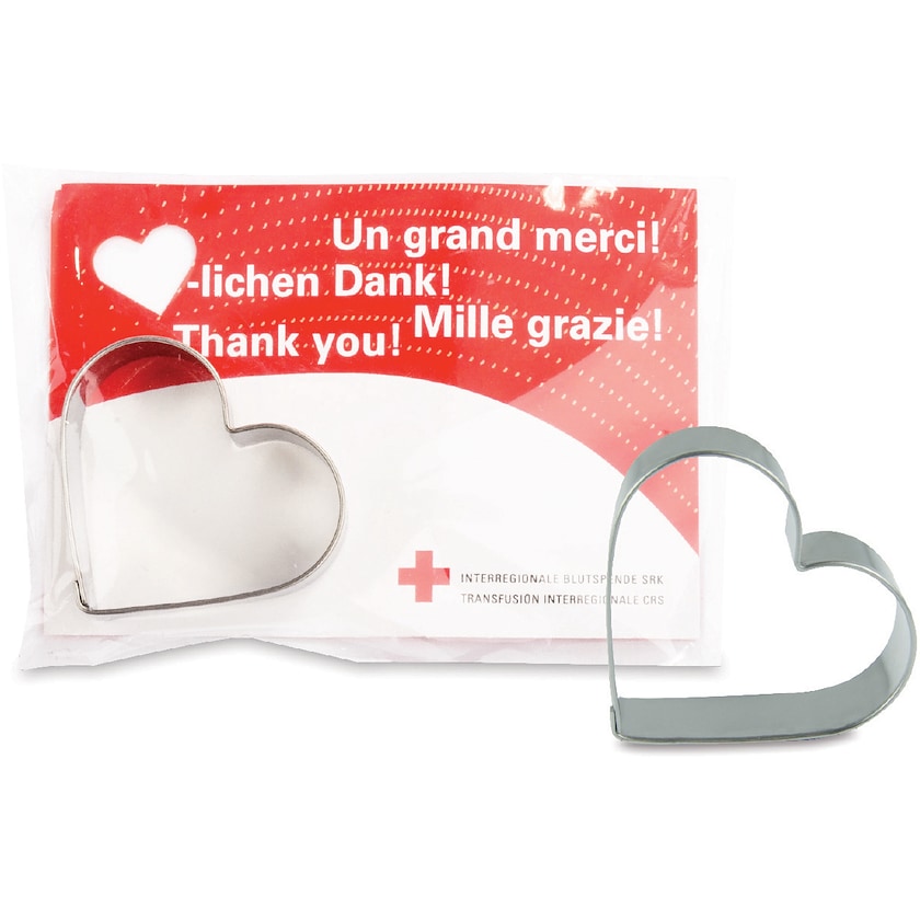 Hjerteformet kakeform i polybag med digitaltrykket papirinnslag. Papirinnslaget trykkes på begge sider. Et hjertelig reklameprodukt med stor reklameoverflate!