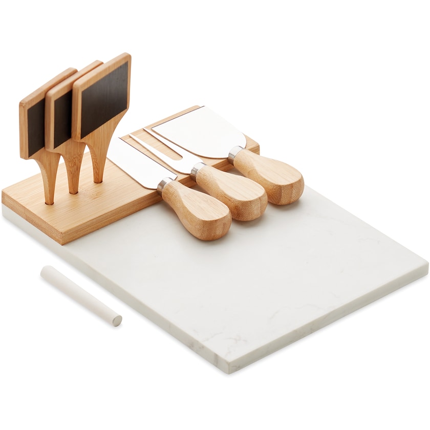 Ostebrett av marmor med tilhørende ostekniver og osteskilt. En luksuriøs gave til alle osteelskere. Med osteskiltene kan du enkelt presentere de ulike ostevariantene eller snacksen. 1 kritt inkludert. Leveres i gaveeske. Lasergraveringen gjøres på bambusdelen.