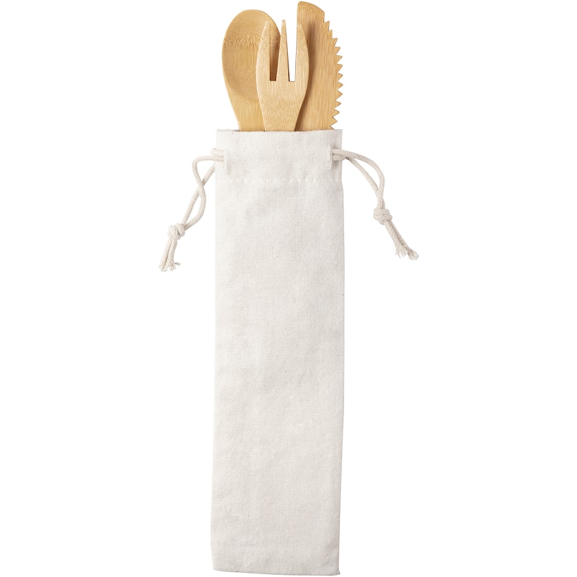 Bestikksett av ekte bambus. Settet leveres i en naturfarget bambuspose. Merking kan enten skje med trykk på posen eller lasergravering på ett av bestikket.