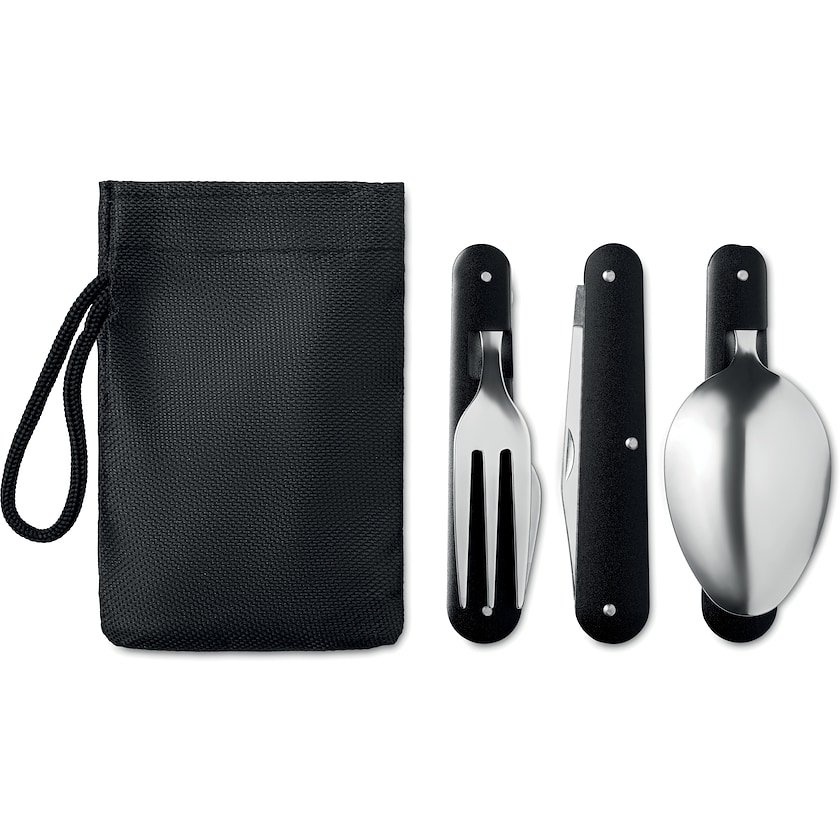 Campingbestick i rustfritt stål. Settet inneholder en kombinasjonsskje, en gaffel og en kniv. Leveres i en sort oppbevaringspose. Trykket skjer på oppbevaringsposen.