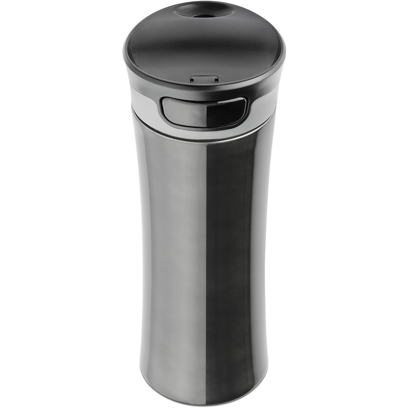 Moderne designet termoskopp som rommer 40 cl. Holder på temperaturen i opptil 10 timer. Lokket åpnes med en spesiell knapp. Merking skjer kun med lasergravering.