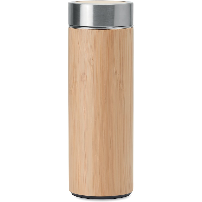 Termos av rustfritt stål som er kledd med bambus. Innvendig er det en te-infuser til deg som elsker te. Termosen har doble vegger som holder drikken skikkelig varm.