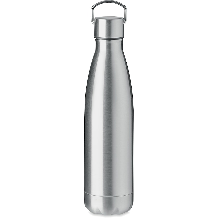 Vakker termosflaske av rustfritt stål. Velg mellom trykk og lasergravering. I lokket er det et håndtak som gjør at termosen er lett å bære. Lekkasjefri.