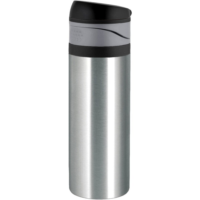 Pent designet ståltermos fra Vildmark. Termosen har et behagelig lokk som kan åpnes med en hånd, og er umulig å åpne uten å mene det.