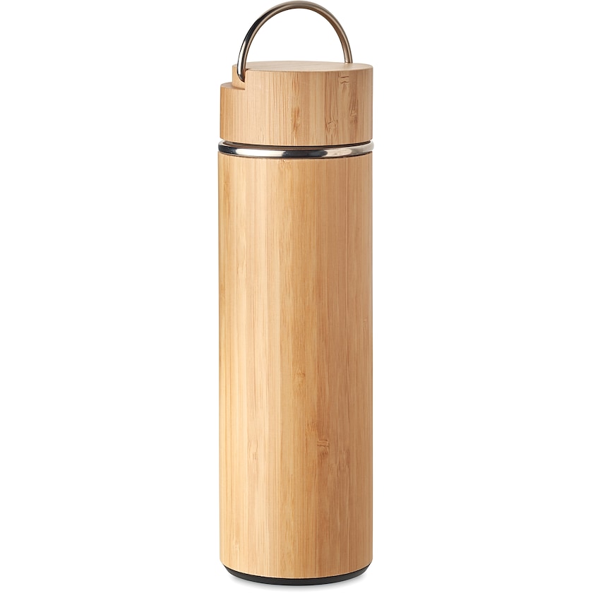 Termos av rustfritt stål med utside av bambus. Termosen har doble vegger og holder drikken varm lenge. Innvendig er det en te-infuser til alle som liker te. Termosen er selvfølgelig helt lekkasjesikker.