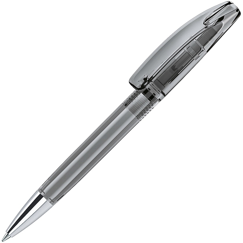 Pen reklamepenn med transparent pennekropp og spiss i krom metall. Pennen har vrimekanisme og kan fås med enten blått eller sort blekk.