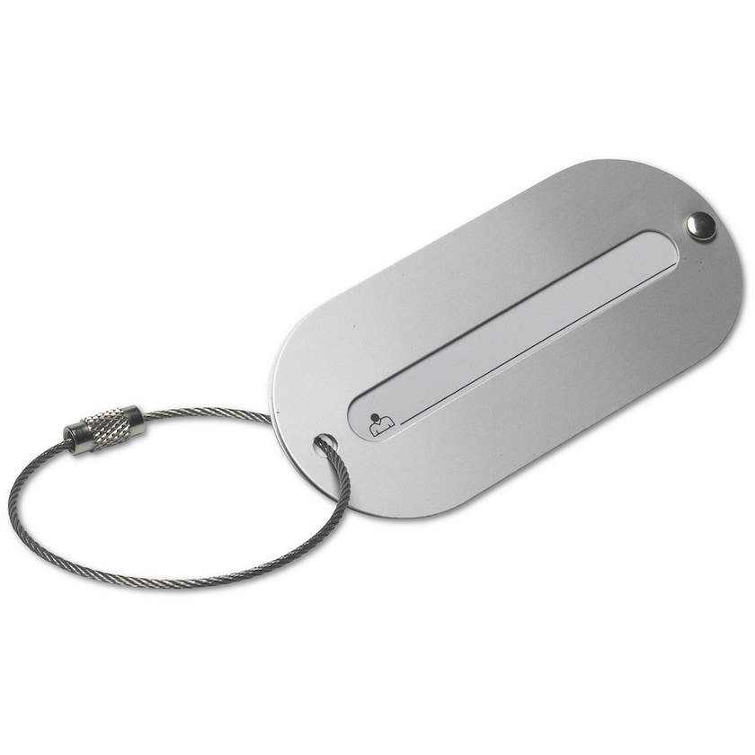 Oval bagasjebrikke i aluminium med plass til navn og personalia.