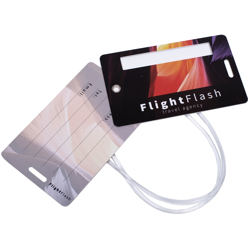Spesialprodusert bagasjemerke av hard PVC. Hvert bagasjemerke inneholder to kort. Trykkprisen refererer digitaltrykk over hele overflaten på frem- og baksiden på begge merkene. Gummireim er inkludert.