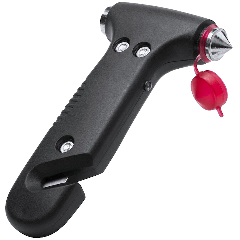 Nødhammer med LED-lykt og beltekniv. Batteri inngår. Et profilprodukt som har potensiale til å redde liv.