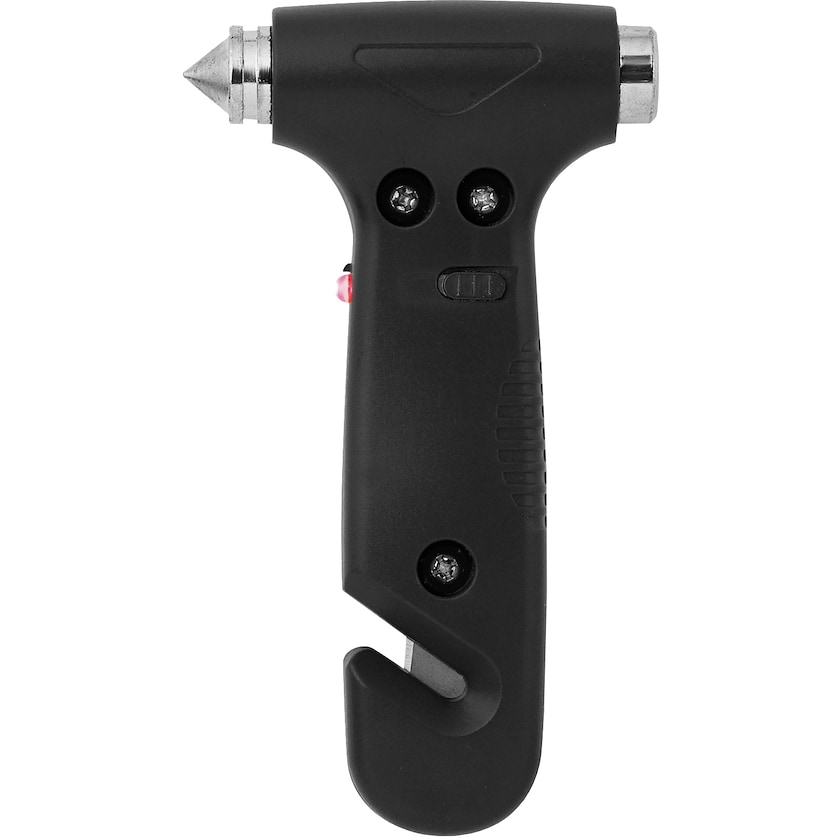 Nødhammer med varsellampe og beltekniv. Drives med 3 stk AG3-batterier (inngår).