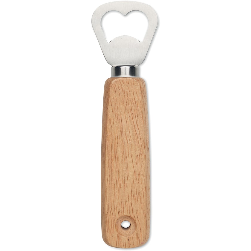 Flaskeåpner med håndtak av gummitre. Merking gjøres enten med trykk eller lasergravering.