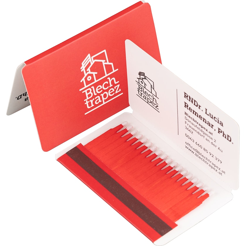 Fyrstikkmappe i samme form og størrelse som et kredittkort. Formen gir bra plass til trykket. Inneholder 18 fyrstikker. Du velger fritt blant 16 forskjellige farger på fyrstikkhodene og 7 forskjellige trefarger. Trykk i maks fire farger gjøres i henhold til pantoneskalaen og over i CMYK.