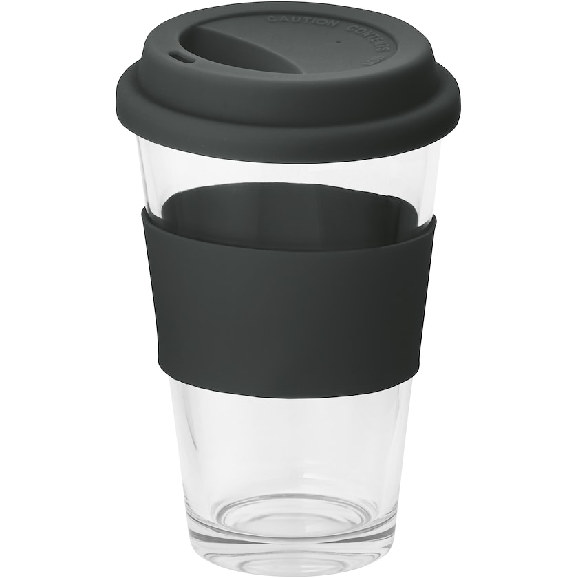 Glass med lokk og silikongrep Takket være grepet passer Perris perfekt til varme drikker. Trykket gjøres på lokket. Det er bare mulig å ha én farge på trykket.