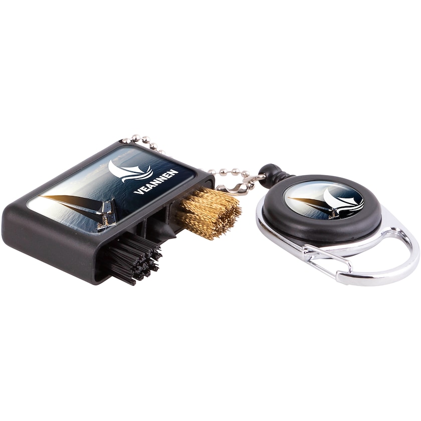Køllebørste festet i en heiskortholder. Køllebørsten har en børste av messing og en av nylon. Dessuten har den en praktisk rengjøringsstift. Trykket gjøres med digitaltrykk på både køllebørsten og heiskortholderen. Trykket beskyttes av et epoksylag som gir trykket et luksuriøst utseende.
