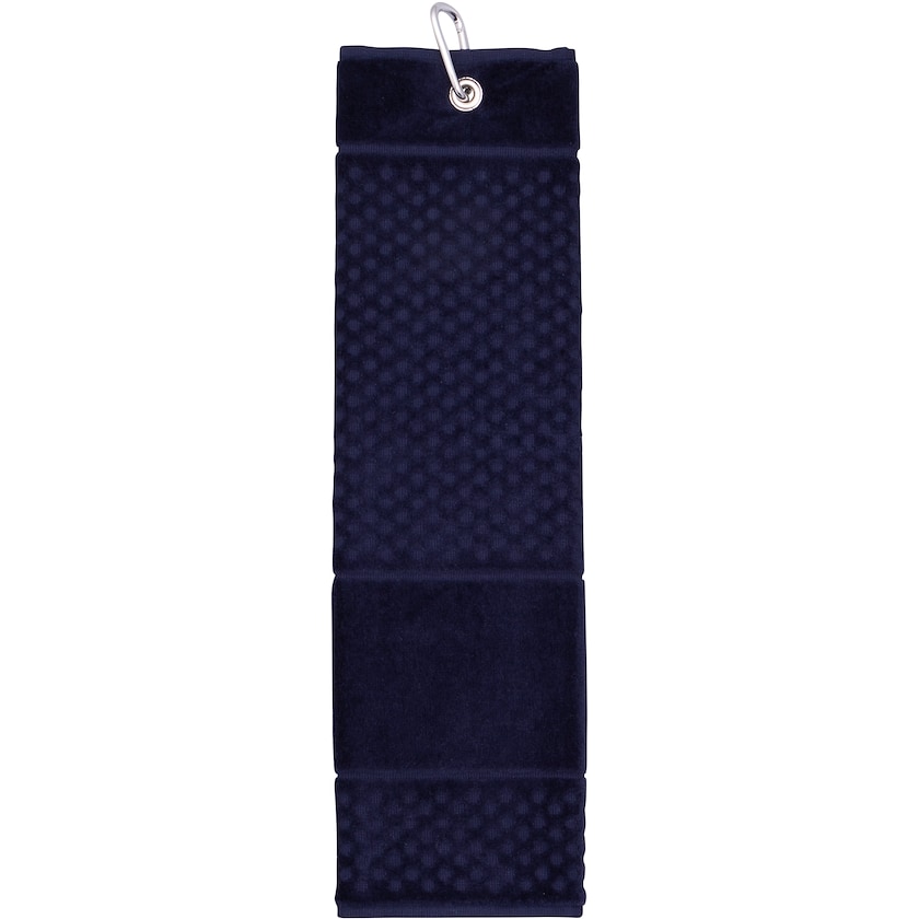 Luksuriøst golfhåndkle av kraftig bomull. Håndkledet er laget av et tykt 650 grams stoff og brettet tre ganger. Det er en karabinkrok øverst.
