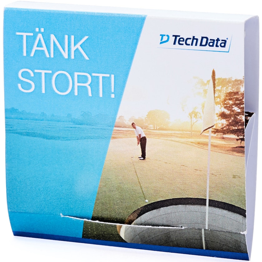 Papphylse med fire golfpegger, markeringsknapp og greengaffel. Du velger fritt peggfarge og om peggene skal være 55 eller 70 mm lange. Prisen inkluderer digitaltrykk på papphylsens utside og på golfmarkøren, samt trykk i 1 farge på peggene. Markeringsknappen har en trykkoverflate på Ø 25 mm og peggene 25 x 4 mm (55 mm pegg), samt 34 x 4 mm (70 mm pegg). Peggene kan alternativt trykkes på hodet, og da har de en trykkoverflate på Ø 9 mm.