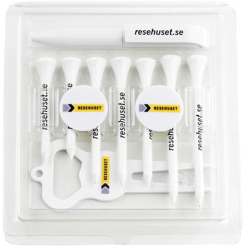 Sett med golftilbehør i stilig gavepakning. Settet inneholder syv trepegger i tre forskjellige lengder, to markeringsknapper, en greengaffel og en blyant. Trykket gjøres på alt golftilbehøret.
