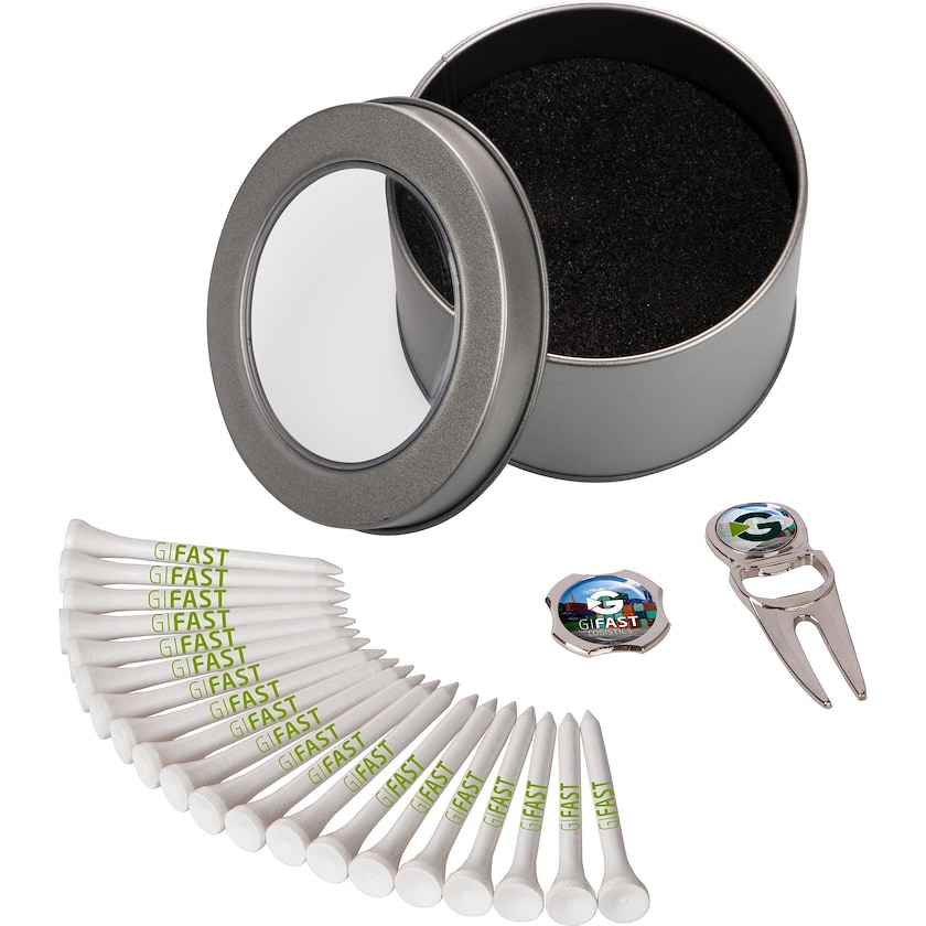 Sett med 20 stk. golfpegger, 1 stk. greengaffel og 1 stk. markeringsknapp. Golfpeggene er 70 mm lange og laget av tre. Settet leveres i en stilig gaveeske av metall. Trykkprisene inkluderer 1-fargetrykk på golfpeggene og digitaltrykk på greengaffelen og markeringsknappen.