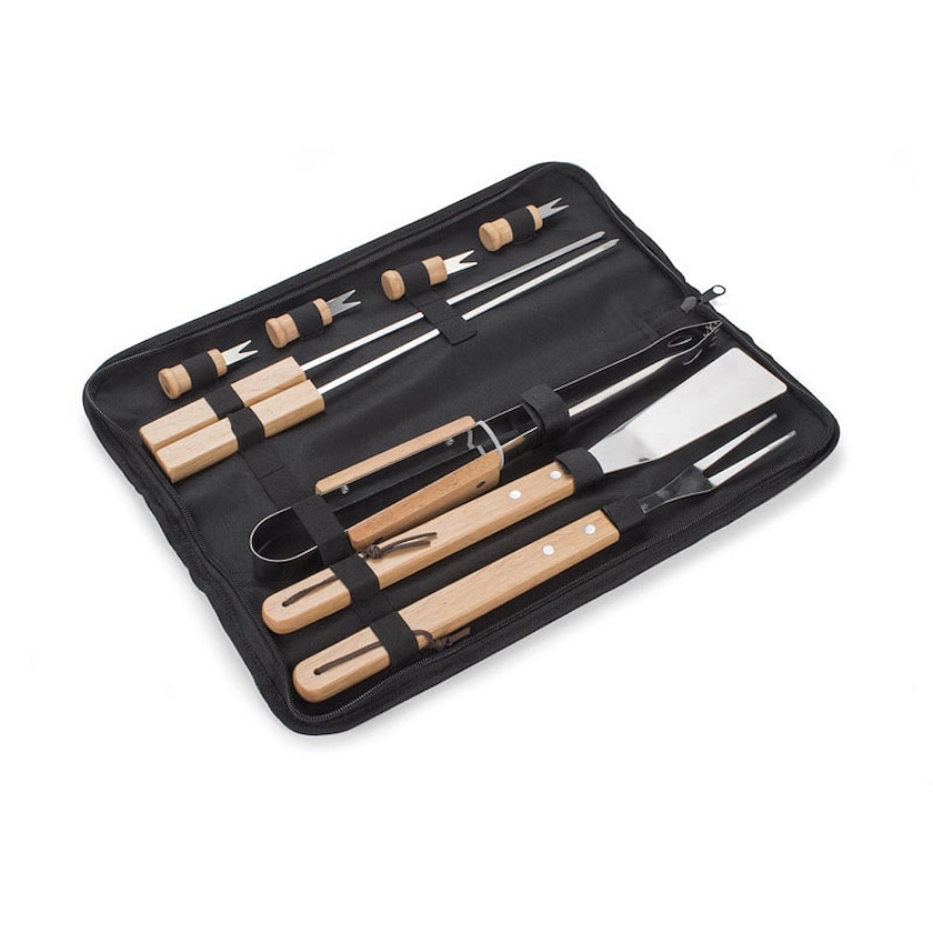 Luksuriøst grillsett i praktisk oppbevaringsfutteral. Alle delene er laget av tre og rustfritt stål. Trykket skjer på futteralet.