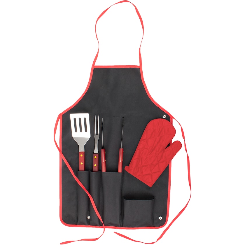 Trivelig grillsett med oppbevaringsfuteral og forkle i ett. Settet inneholder stekespade, grilltang og grillgaffel med trehåndtak samt grytevott og forkle.