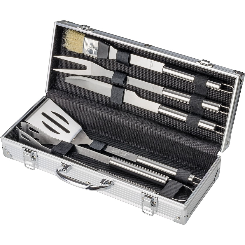Sett med fem ulike grillredskaper i en påkostet oppbevaringseske. Merking skjer med lasergravering på en metallplate på oppbevaringesken. Et trivelig sett for sommerens grillkvelder!