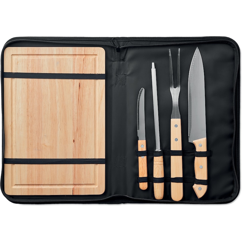 BBQ-sett til sommerens grillkvelder. Settet inneholder alt til en vellykket grillkveld. Trykket gjøres på oppbevaringsmappen og lasergraveringen på skjærebrettet.