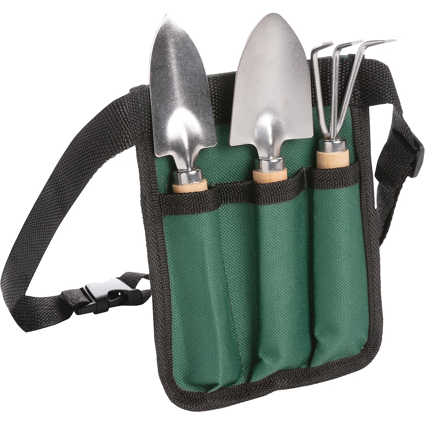 Hagesett i tre deler. Settet består av en stor spade, en liten spade samt en kultivator.