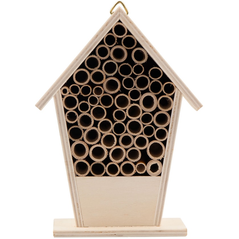 Insekthus til en frodig hage. Insekthuset er laget av finér og siv. Merking gjøres med lasergravering.