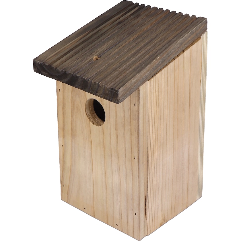 Rustikk fuglekasse av tre. Åpningen er 30 mm, noe som passer perfekt til småfugl. Treverket er FSC-sertifisert. Merking gjøres med lasergravering.