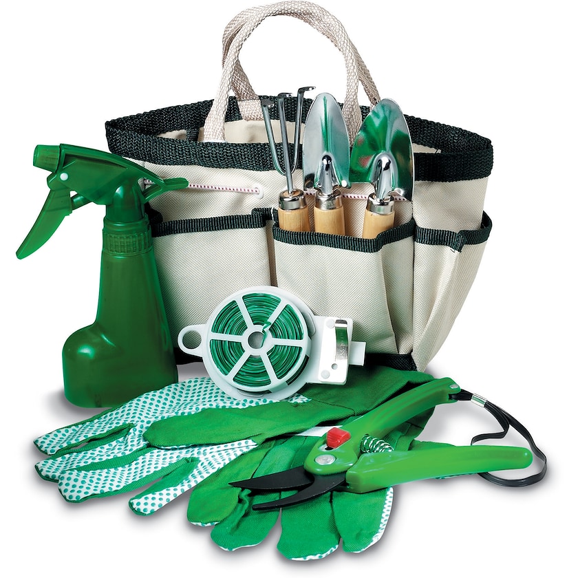 Stort hagesett i 8 deler. Inneholder oppbevaringsbag i bomull, hagehansker, beskjæringsredskap, krafse, blomstertråd og to spader. Merking skjer på oppbevaringsbagen.