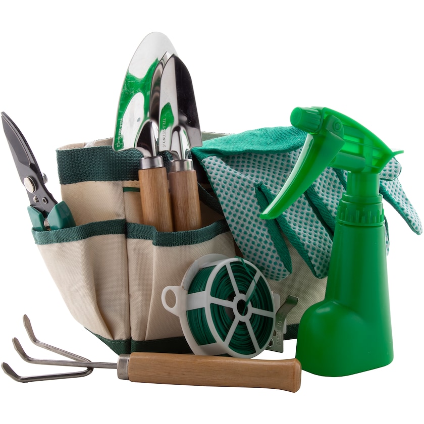 Sett med alt du trenger til hagejobben. Settet inneholder, foruten vesken, en hagesaks, en rake, to hagespader, en hagetråd med kniv, en sprayflaske og et par hansker.