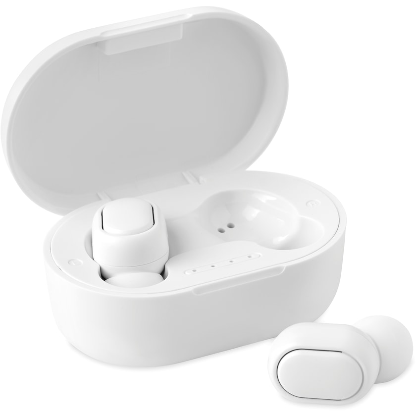 Trådløse hodetelefoner i resirkulert ABS-plast. Hodetelefonene er av typen True Wireless Stereo 5.0 og har et innebygget batteri som gir 4 timers spilletid. Oppbevaringsfutteralet fungerer også som ladestasjon. Kabel, mikro-USB, inkludert.