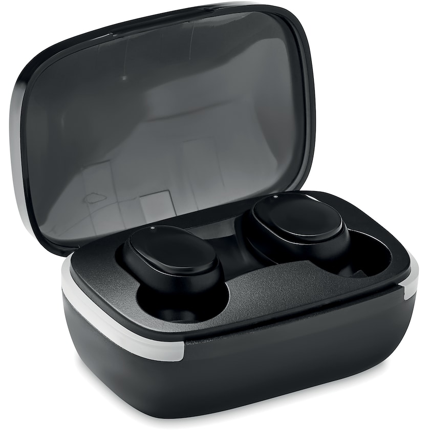 Sett med trådløse hodetelefoner. Hodetelefonene er av typen True Wireless Stereo 5.0. Spilletiden er ca. 3 timer. Mikro USB-kabel inkludert. Futteralet fungerer også som ladestasjon.