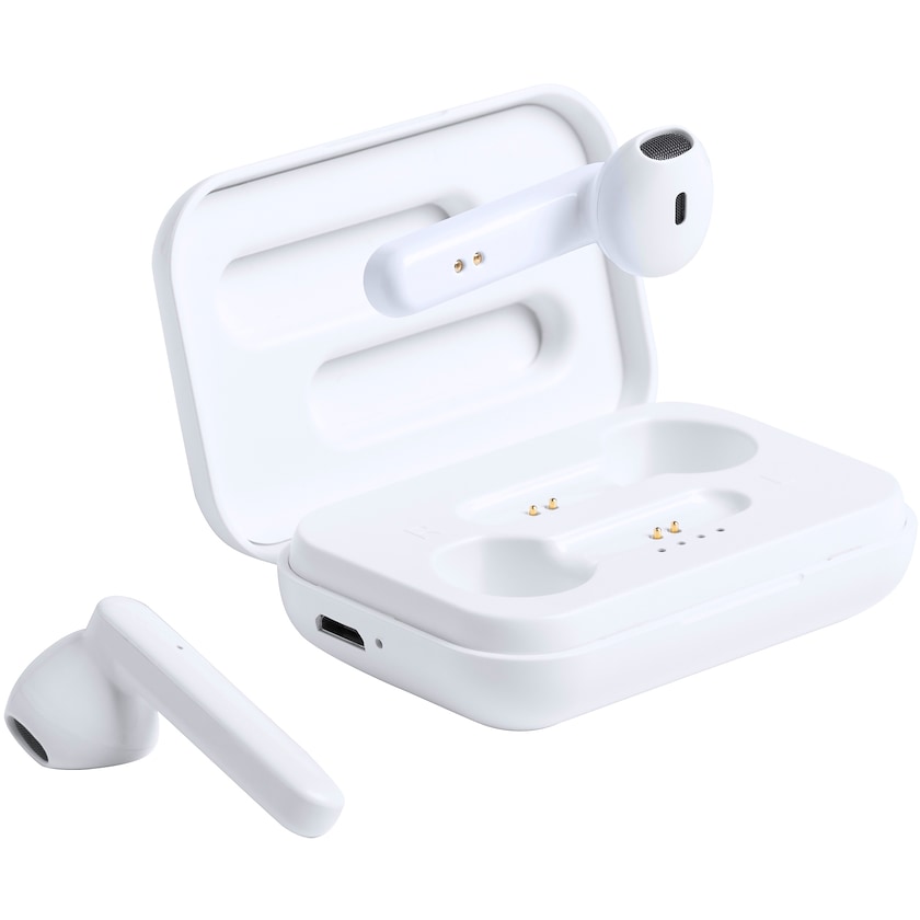 Trådløse hodetelefoner i oppbevaringsfutteral. Hodetelefonene lades i oppbevaringsfutteralet. USB-ladekabel følger med.