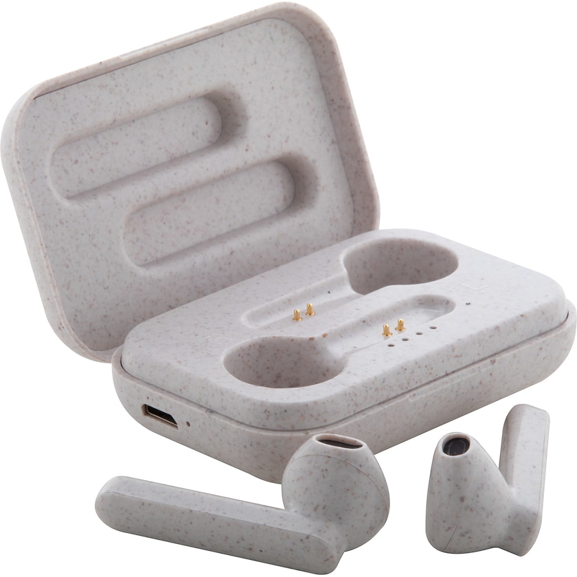 Miljøvennlig trådløse hodetelefoner med trykk. Higginsport er laget av økologisk hvetehalm. USB ladekabel inkludert. Leveres i en naturfarget pappeske.
