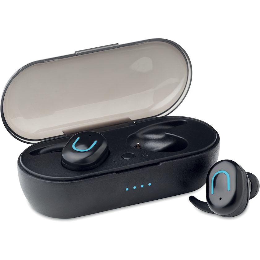 Trådløse hodetelefoner med stereolyd. Spilletiden er ca. 3 timer på én lading. Mikro USB-kabel inkludert. Leveres i en boks som også fungerer som ladestasjon.