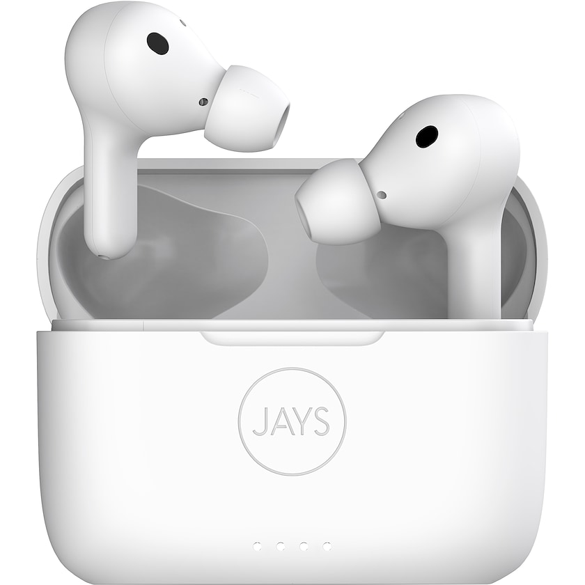 Førsteklasses in-ear hodetelefoner fra Jays. Hodetelefonene har fantastisk lyd og støyreduksjon. Batteritiden er 5 timer. Hodetelefonene er også utstyrt med en utmerket mikrofon, talekontroll for Siri og Google Assistant. Tre ulike gummipropper inkludert til optimal passform. Lading gjøres trådløst eller vis kabel gjennom esken. Trykket gjøres på esken.