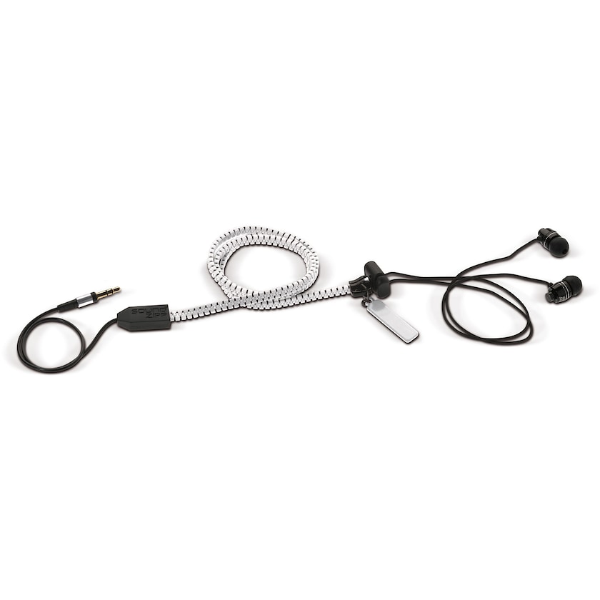 In-ear-hodetelefoner med glidelås som forkorter ledningene. Glidelåsen gjør risikoen for knuter på ledningene mindre. Merking skjer på glidelåsen. Leveres i pen gavepose av mikrofiber.