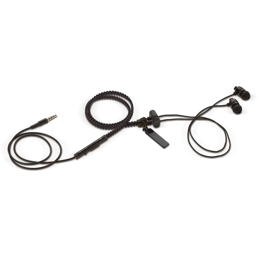 In-ear-hodetelefoner med glidelås som forkorter ledningene. Glidelåsen gjør risikoen for knuter på ledningene mindre. Merking skjer på glidelåsen. Leveres i pen gavepose av mikrofiber.