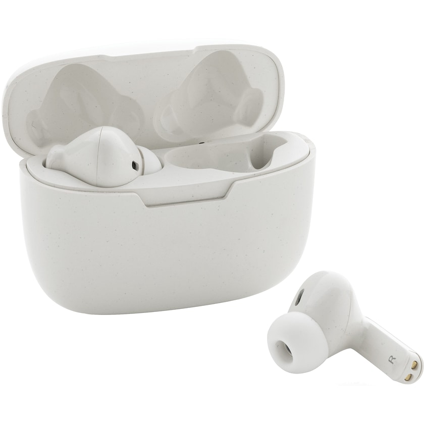 Trådløse hodetelefoner av RCS-sertifisert, resirkulert ABS og TPE. Hodetelefonene fullades i oppbevaringsfutteralet på 1,5 time. Spilletiden er 3 timer. Takket være BT 5.3 er tilkoblingen smidig. Telefonsamtaler kan mottas i stereo. Tre ulike silikonplugger inkludert.