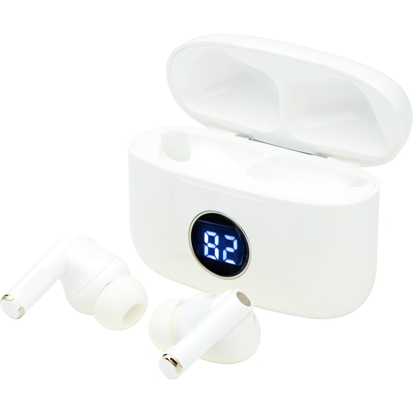 Hodetelefoner med øreplugger av typen True Wireless Stereo. Hodetelefonene har aktiv støyreduksjon, noe som minsker støy med opptil 20 dB, hvilket gir en fantastisk musikkopplevelse. Avanserte funksjoner som innebygd støtte til flerfunksjonsknapper mm. Avspillingstien er minst 3 timer og hodetelefonene kan lades fire ganger på bare en lading. Leveres med tre justerbare ørepropper.