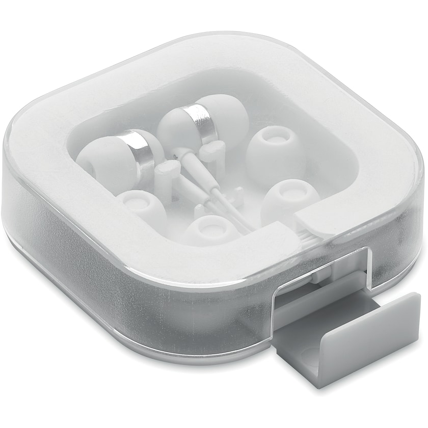 Hodetelefoner med futteral med mobilstativ. Kabelen er 120 cm lang. Ekstra silikonplugger i tre forskjellige størrelser inkludert.