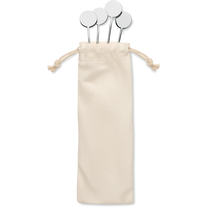 Sett med 4 cocktailpinner av rustfritt stål. Velg mellom to farger. Trykket gjøres på oppbevaringsposen og lasergraveringen på en av cocktailpinnene.