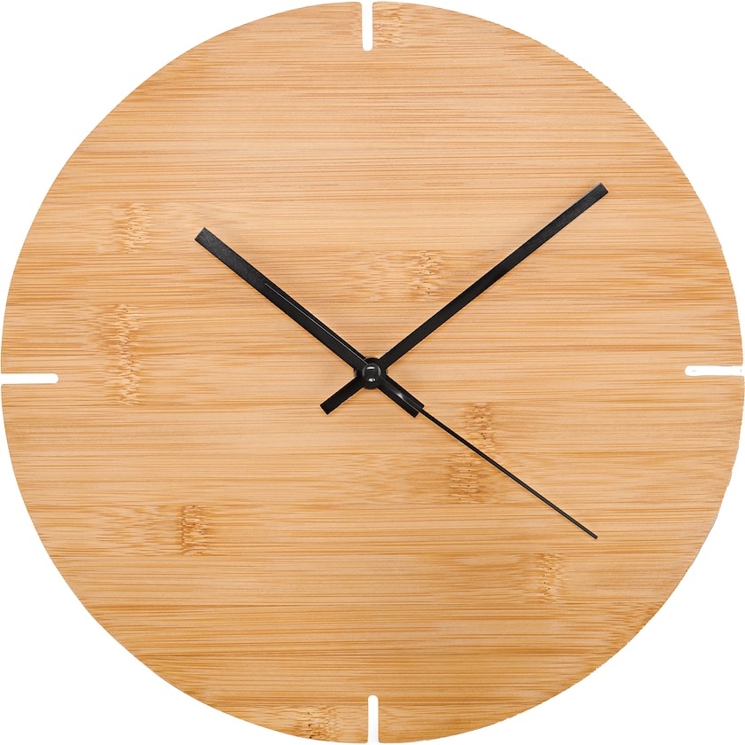 Veggklokke av bambus. Klokken bruker 1 stk AA-batteri (ikke inkludert). Merking gjøres med lasergravering.