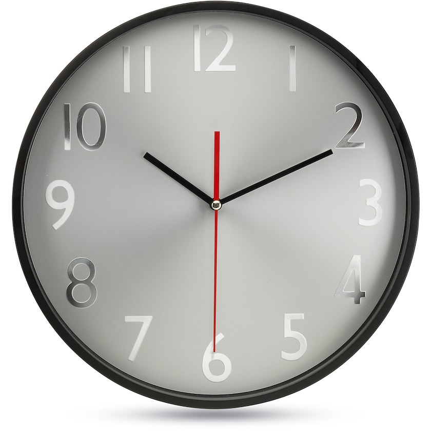 Veggklokke med sølvfarget urskive og sort kant. Tallene er av aluminium og selve urskiven beskyttes av glass. Drives med 1 stk AA-batteri (inngår ikke). Det er kun mulig med trykk i en farge.