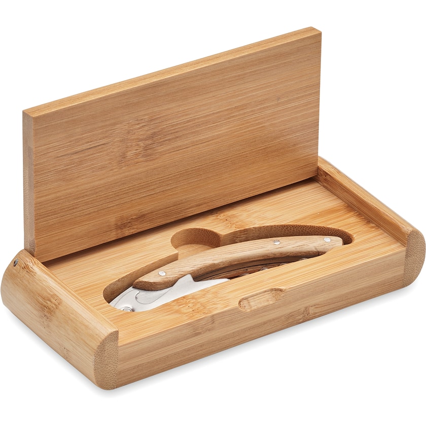 Eksklusiv vinåpner av bamus og rustfritt stål. Leveres i en gaveeske av bambus.