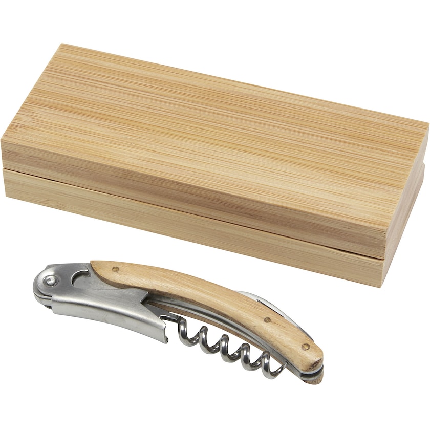 Korketrekker av rustfritt stål og bambus. Leveres i en oppbevaringseske som også er laget av bambus. Bambusen er dyrket økologisk bærekraftig. Lasergraveringen gjøres på oppbevaringsesken.