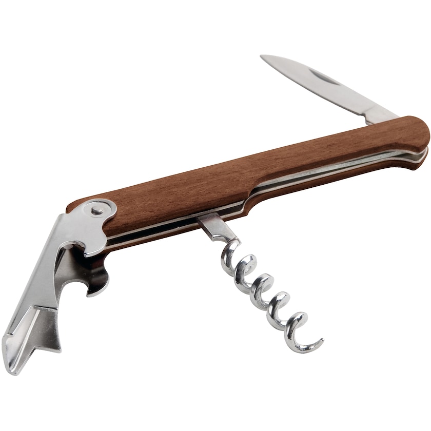 Elegant korketrekker av tre og stål. Korketrekkeren har også flaskeåpner og en liten kniv. Bestill korketrekker av tre med trykk hos Axon Profil!