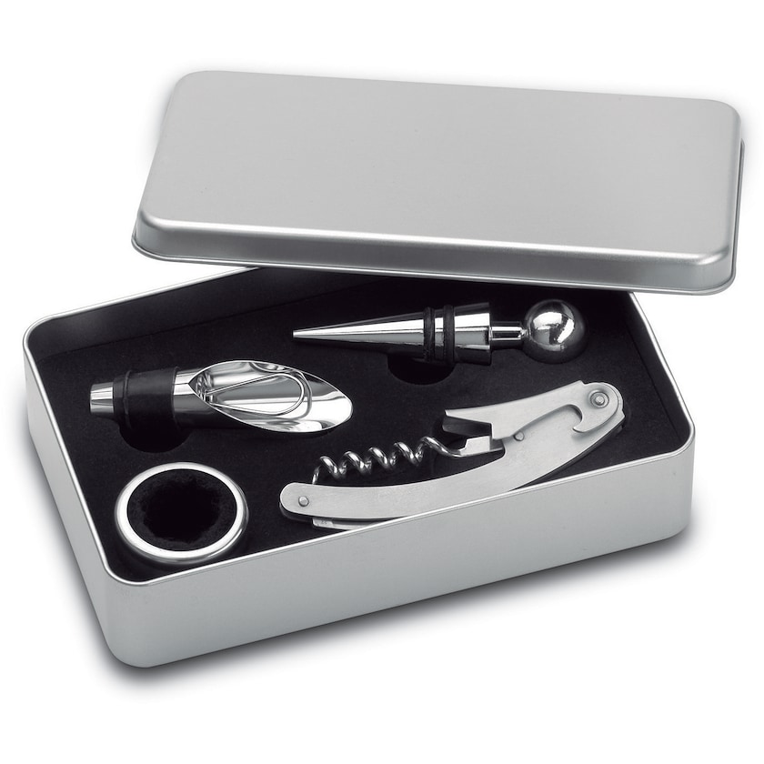 Korketrekkersett i fire deler i pen gaveeske av metall. Merking skjer enten med trykk eller lasergravering.
