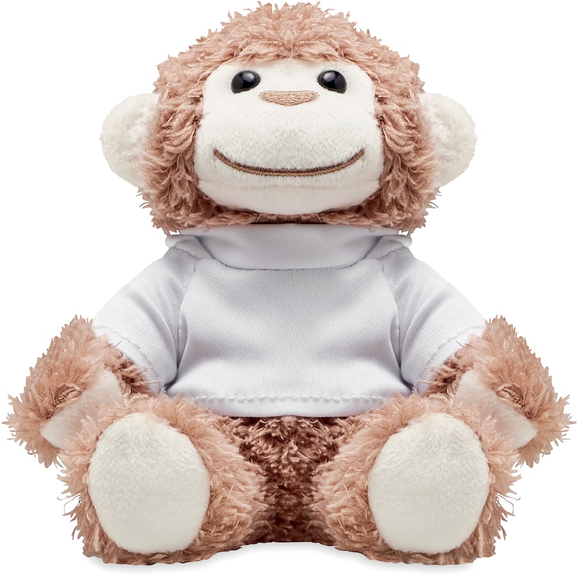 En glad og koselig ape i en hvit hettegenser. Trykket gjøres på hettegenseren.